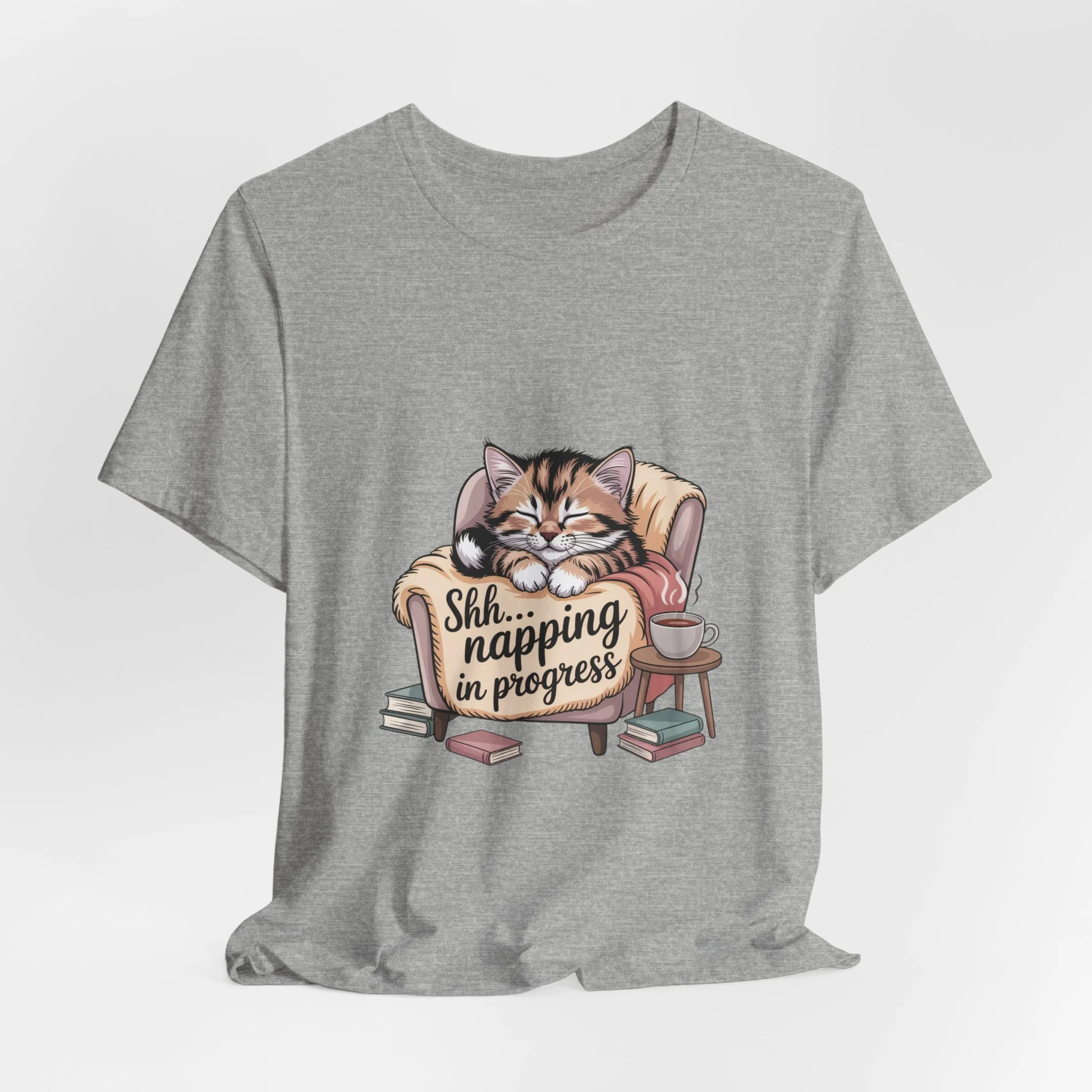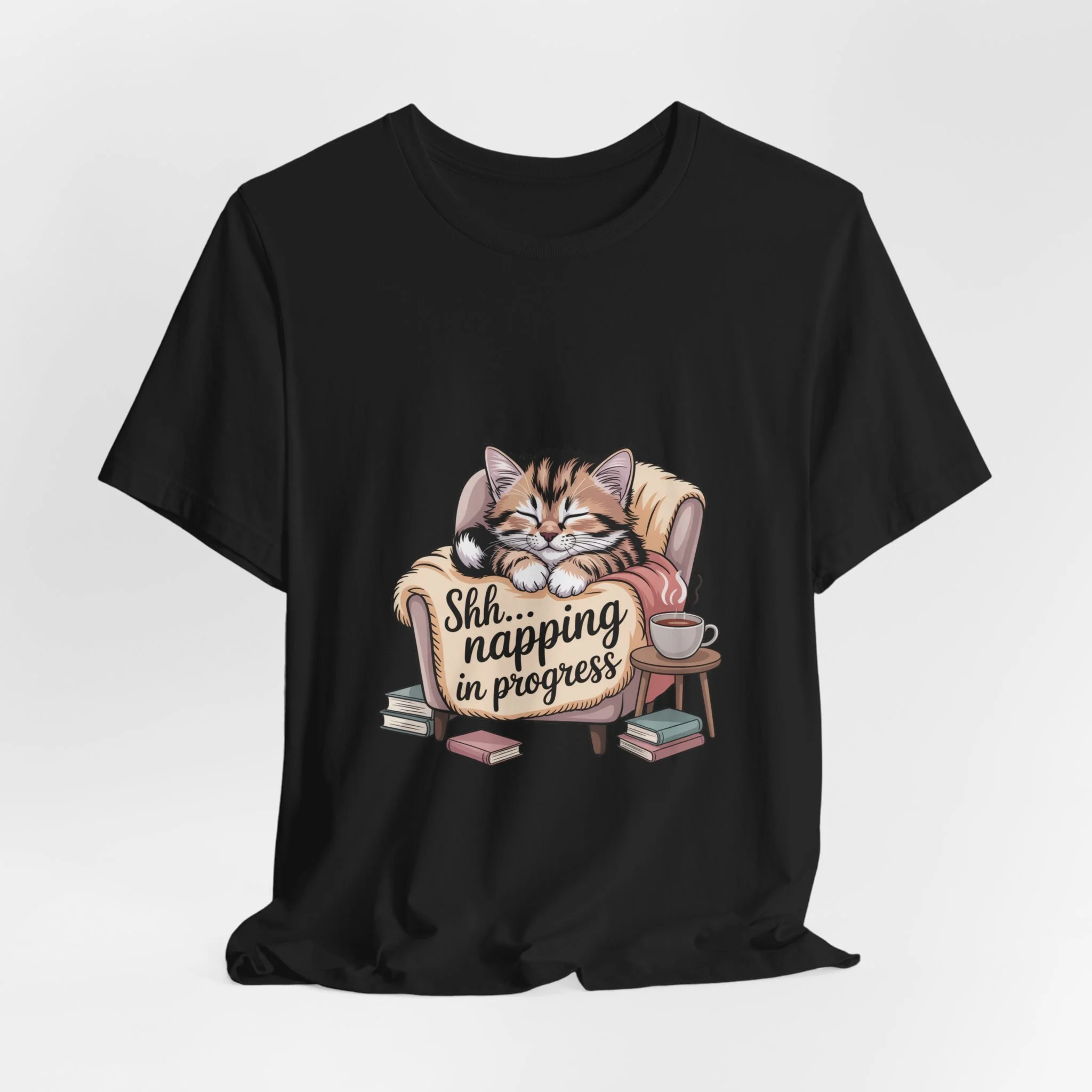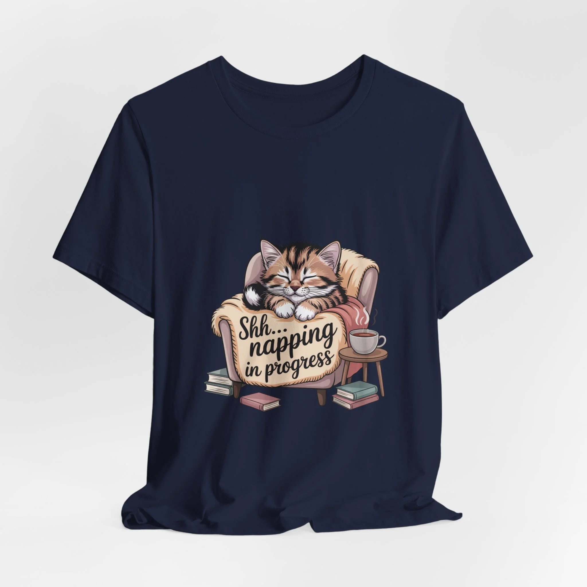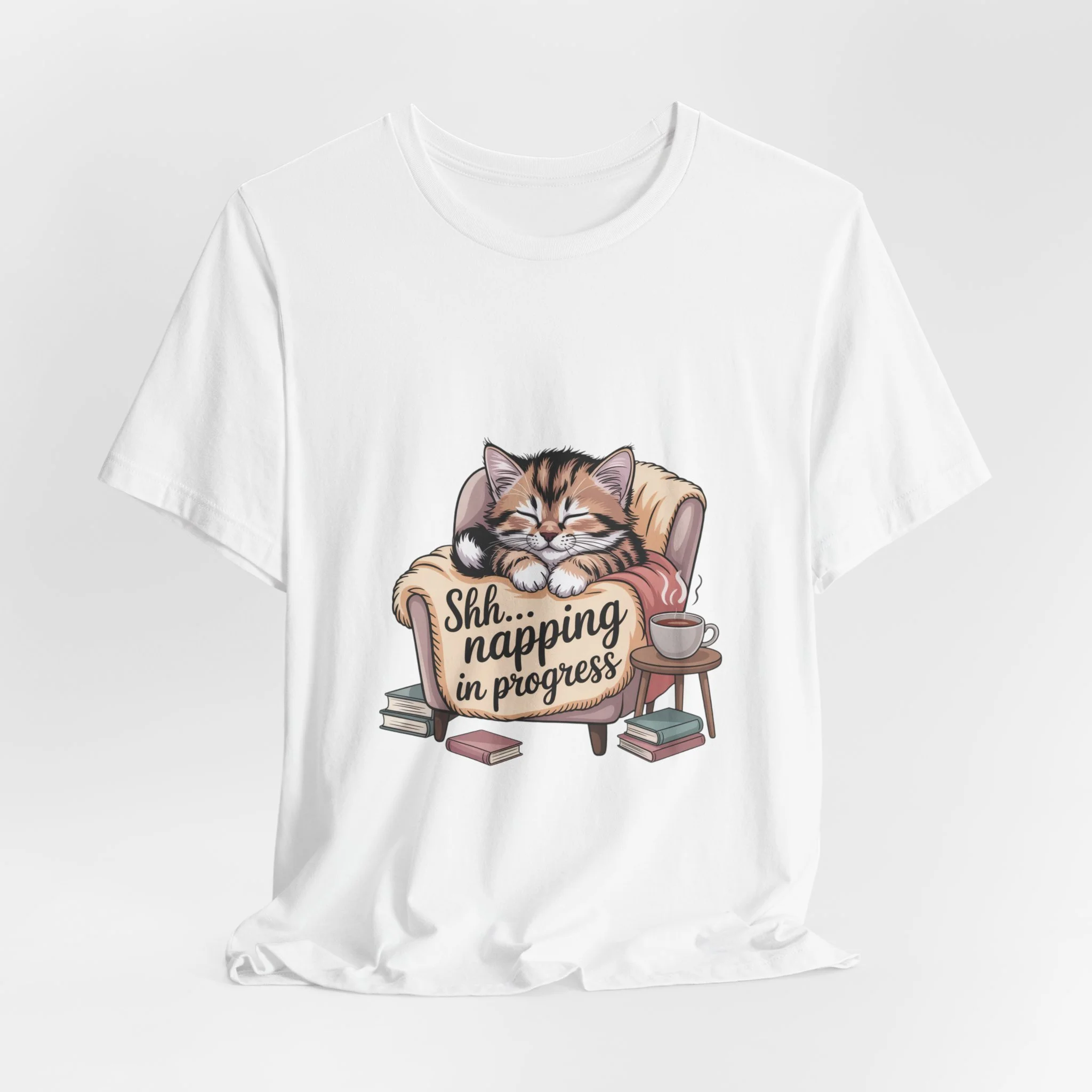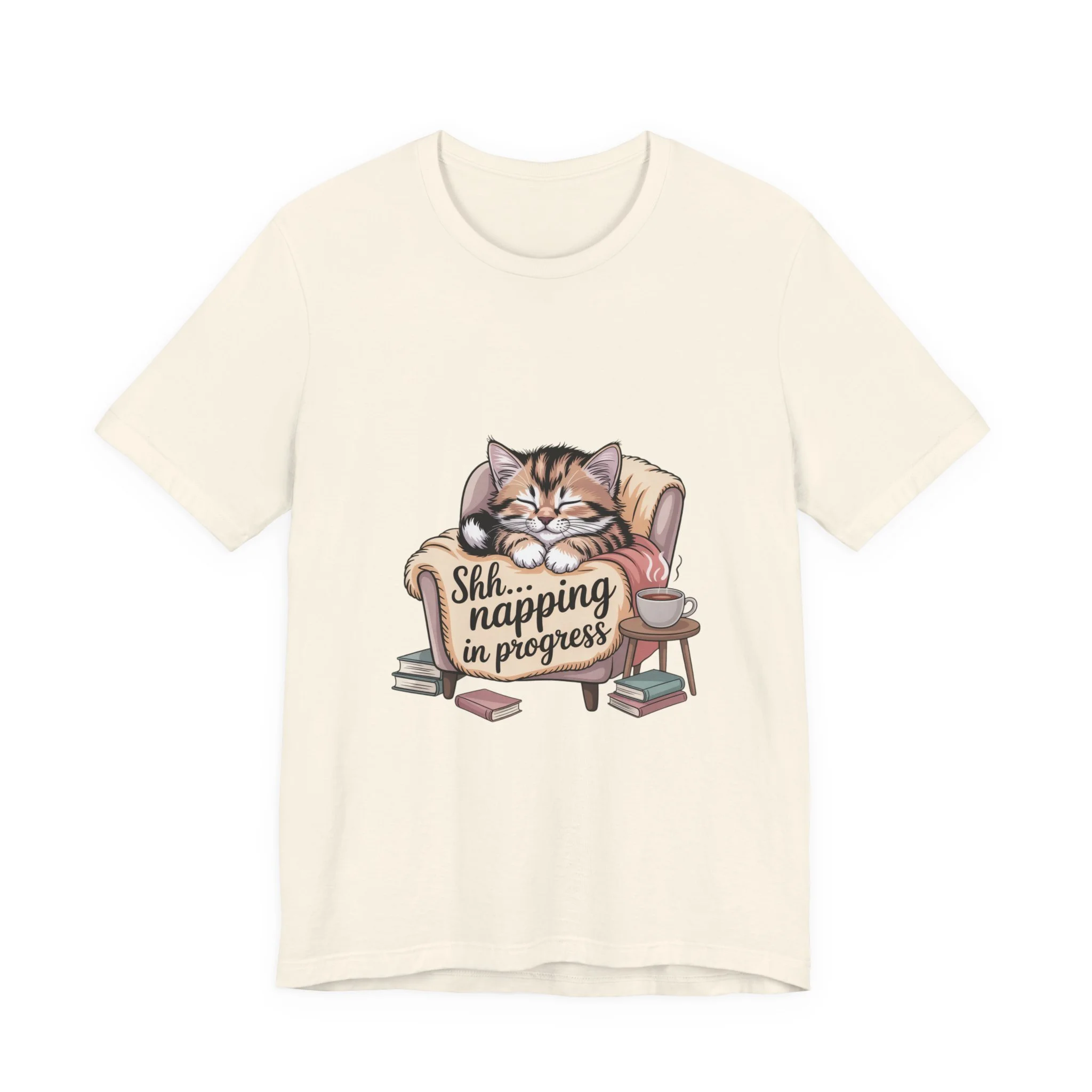 Sink into a slow, cozy afternoon with this soft jersey tee that wears like a gentle invitation to rest. A contented tabby curls in an armchair amid a small scatter of books and a teacup, the warm illustration captioned “Shh... napping in progress.” The lightweight Airlume combed cotton feels breathable against skin and layers easily under a cardigan or over a long-sleeve on chillier days. Clean crew neckline and a retail fit keep the look neat while the ribbed collar and shoulder tape preserve shape wash after wash. For readers, cat lovers, and anyone who treasures quiet downtime, this tee carries a calm, homey vibe — as if you carried a little living-room pause with you wherever you go.